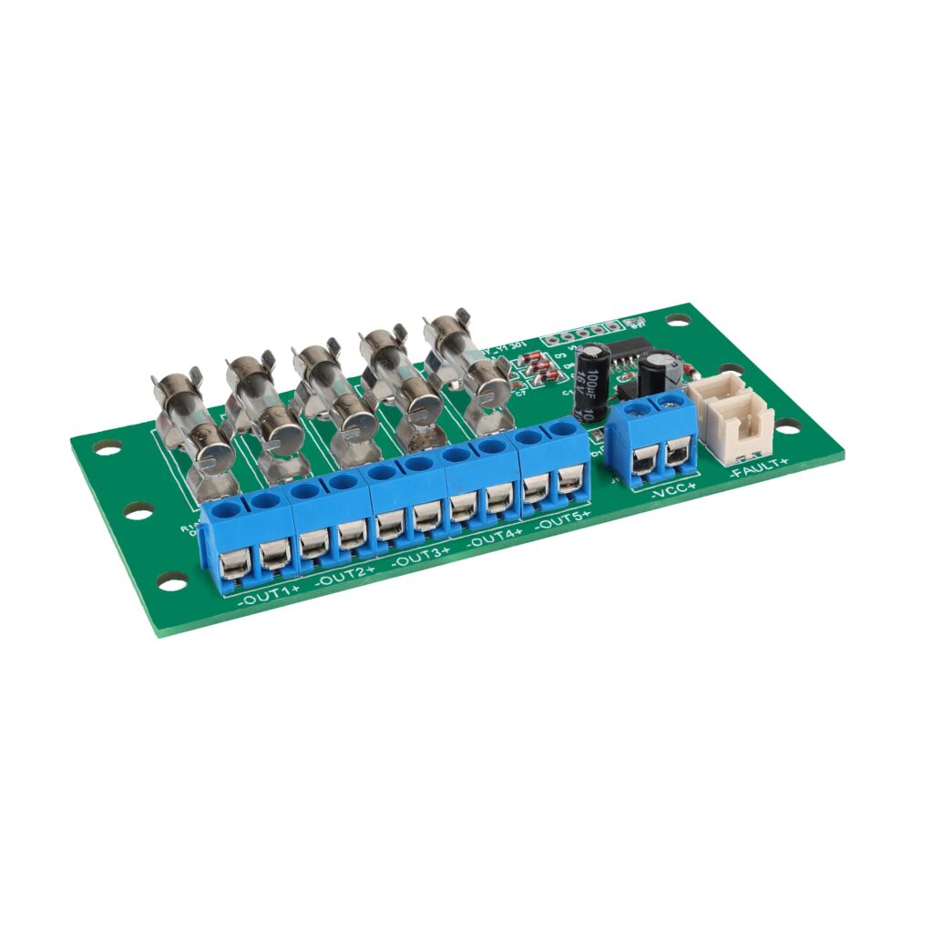 - Voor het 10A model is optioneel een print met 5 x 1A en 5 x 2A gezekerde uitgangen te leveren (alle zekeringen meegeleverd)
