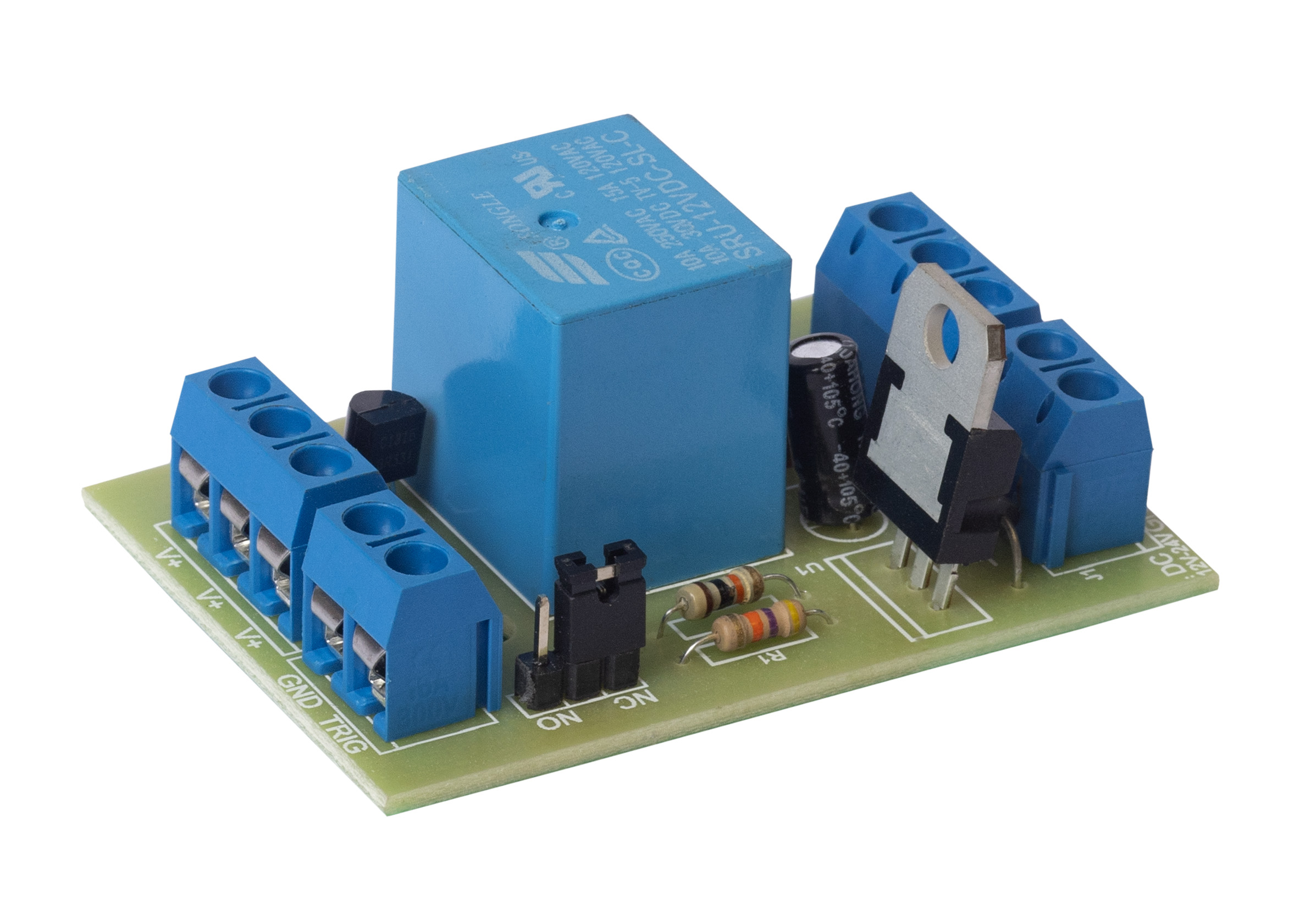 Handig en compact printje voorzien van een 10 ampère relais voor bijvoorbeeld het uitschakelen van de voeding naar de elektrische vergrendeling via een contact van de brandmeldinstallatie. Deze brandmeldprint is geschikt voor 12/24V DC en is voorzien van een maak -of een verbreekcontact.