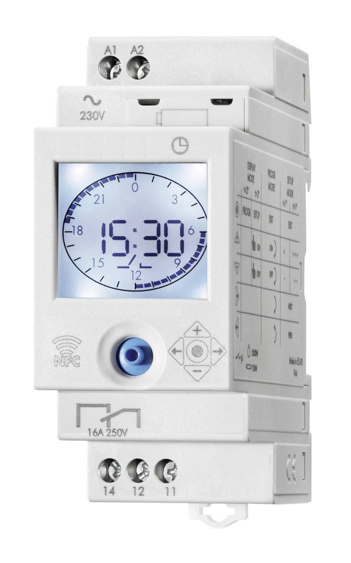 De elektronische schakelklok is te gebruiken voor allerlei toepassingen zoals elektrische vergrendelingen en verlichting. De klok kan per 24 uur elektronisch worden ingesteld. Ook via NFC te programmeren.