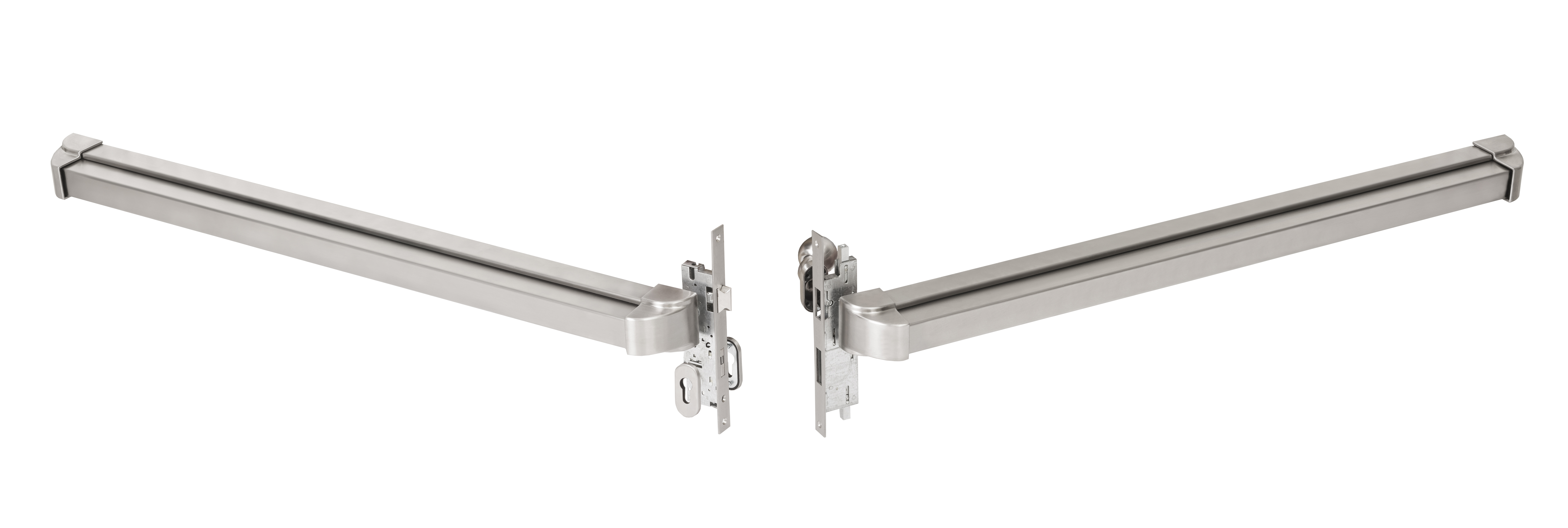 Deze set bestaat uit een mechanisch slot met paniekfunctie E, knopbeslag, twee paniekbalken met balkbediening en alle benodigde onderdelen. Het geheel is geschikt voor dubbele profieldeuren en is geschikt voor brand- en rookwerende deuren.