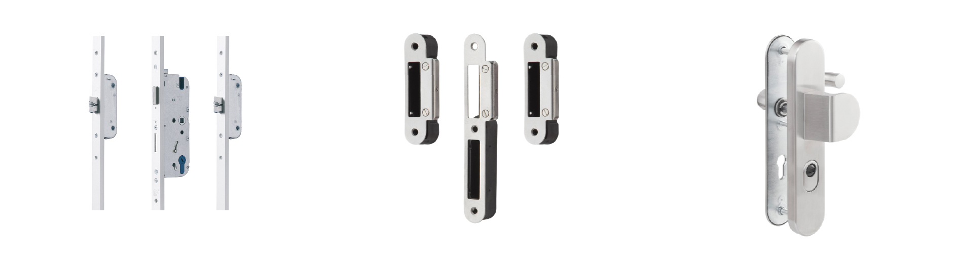 Na het sluiten van de deur vallen de dag- en zelfvergrendelende schoten in de sluitplaten. De deur is gesloten.WERKING VANAF BINNENZIJDE