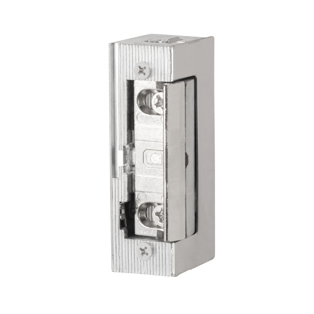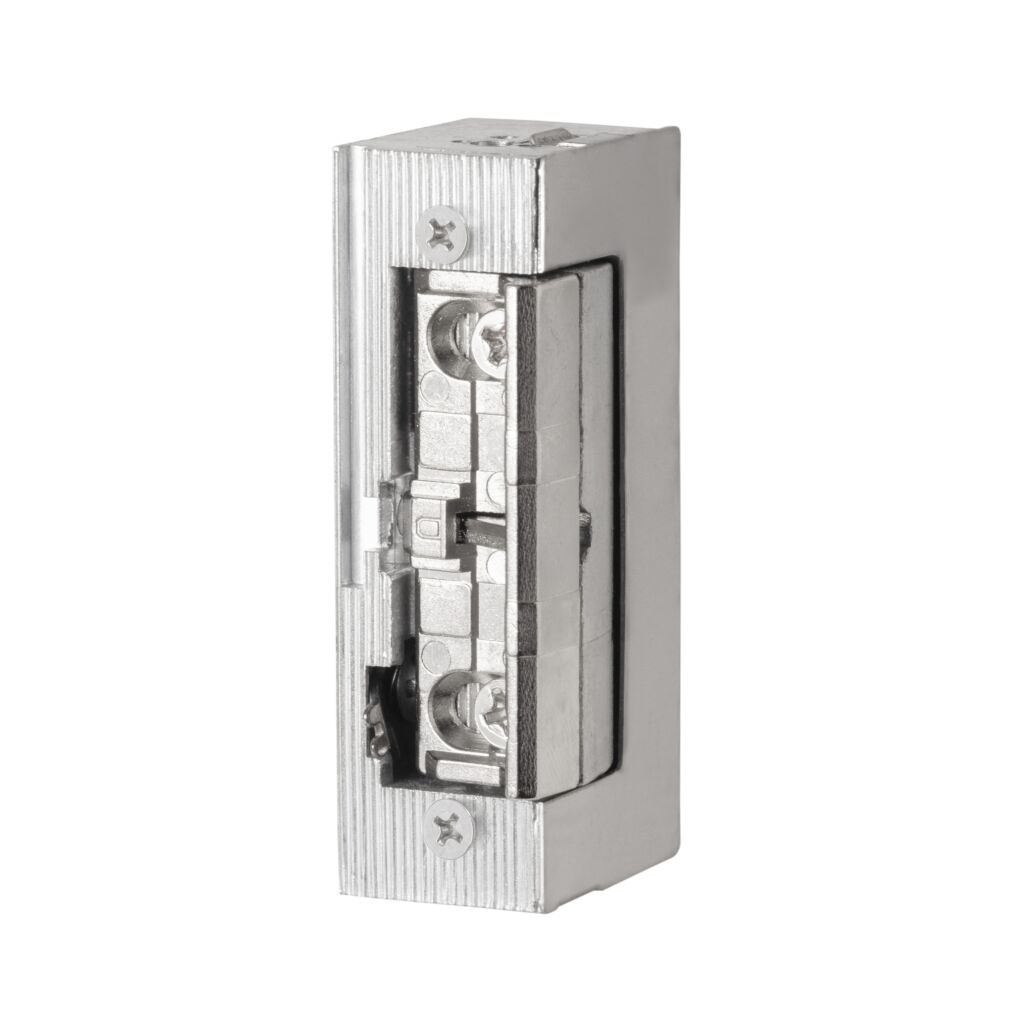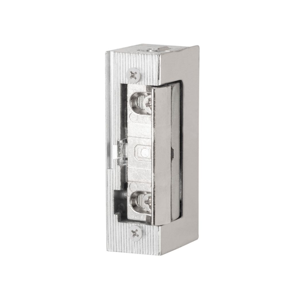 Inbouw elektrische deuropener voorzien van axiale 4 mm verstelbare schootvanger welke buiten de behuizing draait. De deuropener wordt in het kozijn tegenover de dagschoot van een mechanisch slot ingebouwd om deze te vergrendelen of te ontgrendelen.