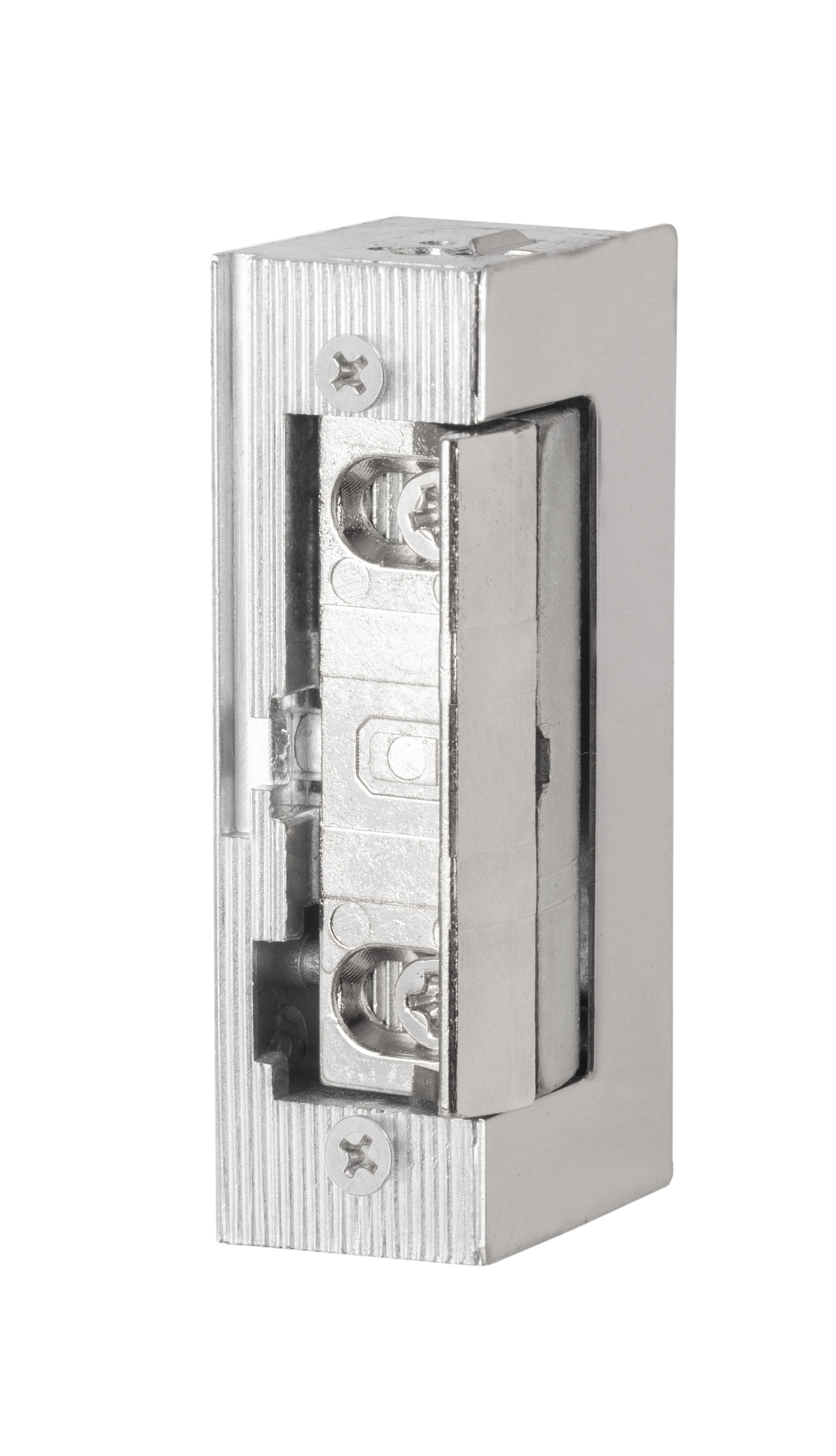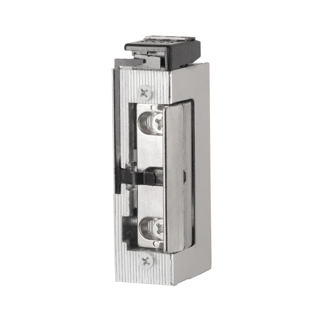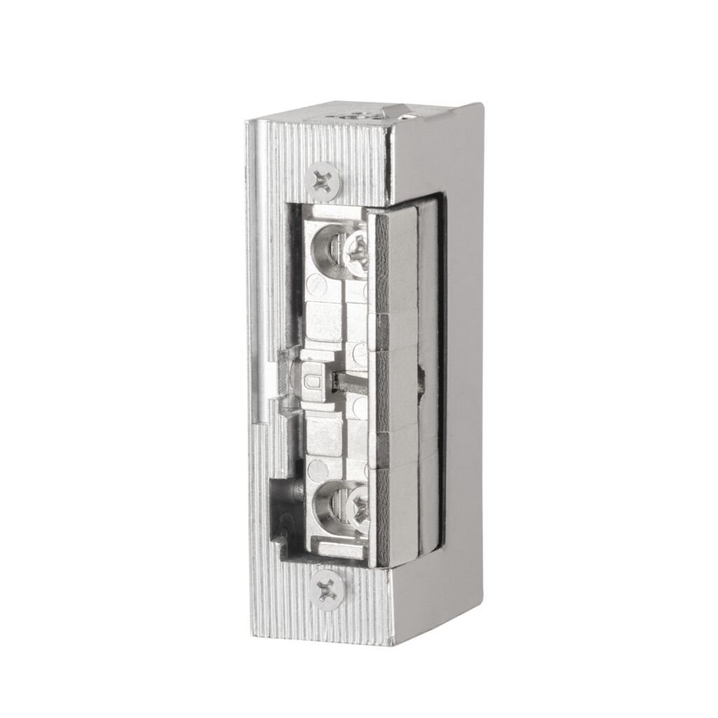 Inbouw elektrische deuropener voorzien van axiale 4 mm verstelbare schootvanger welke buiten de behuizing draait. De deuropener wordt in het kozijn tegenover de dagschoot van een mechanisch slot ingebouwd om deze te vergrendelen of te ontgrendelen.