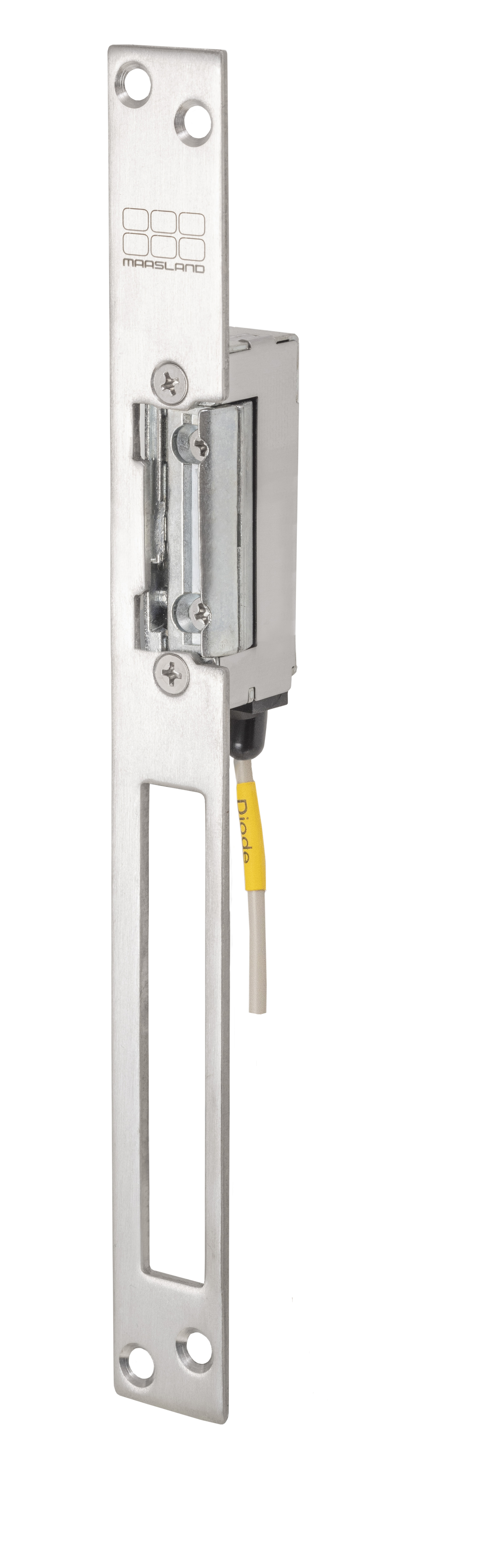 Waterdichte elektrische deuropener speciaal voor buiten toepassingen. De deuropener wordt tegenover het mechanische slot ingebouwd om zo de dagschoot te ver- of ontgrendelen. De lange sluitplaat heeft een uitsparing voor de nachtschoot zodat deze mechanisch kan worden vergrendeld.